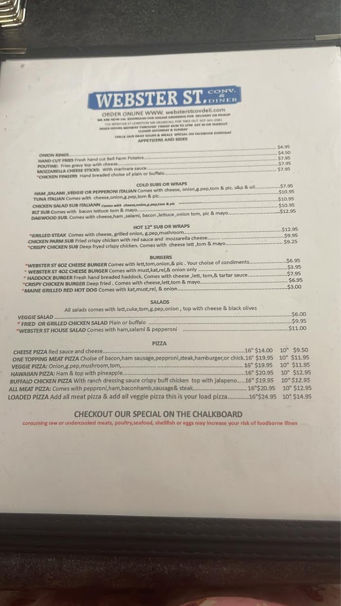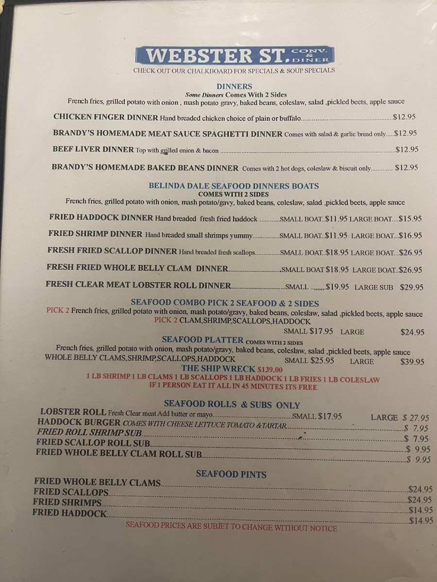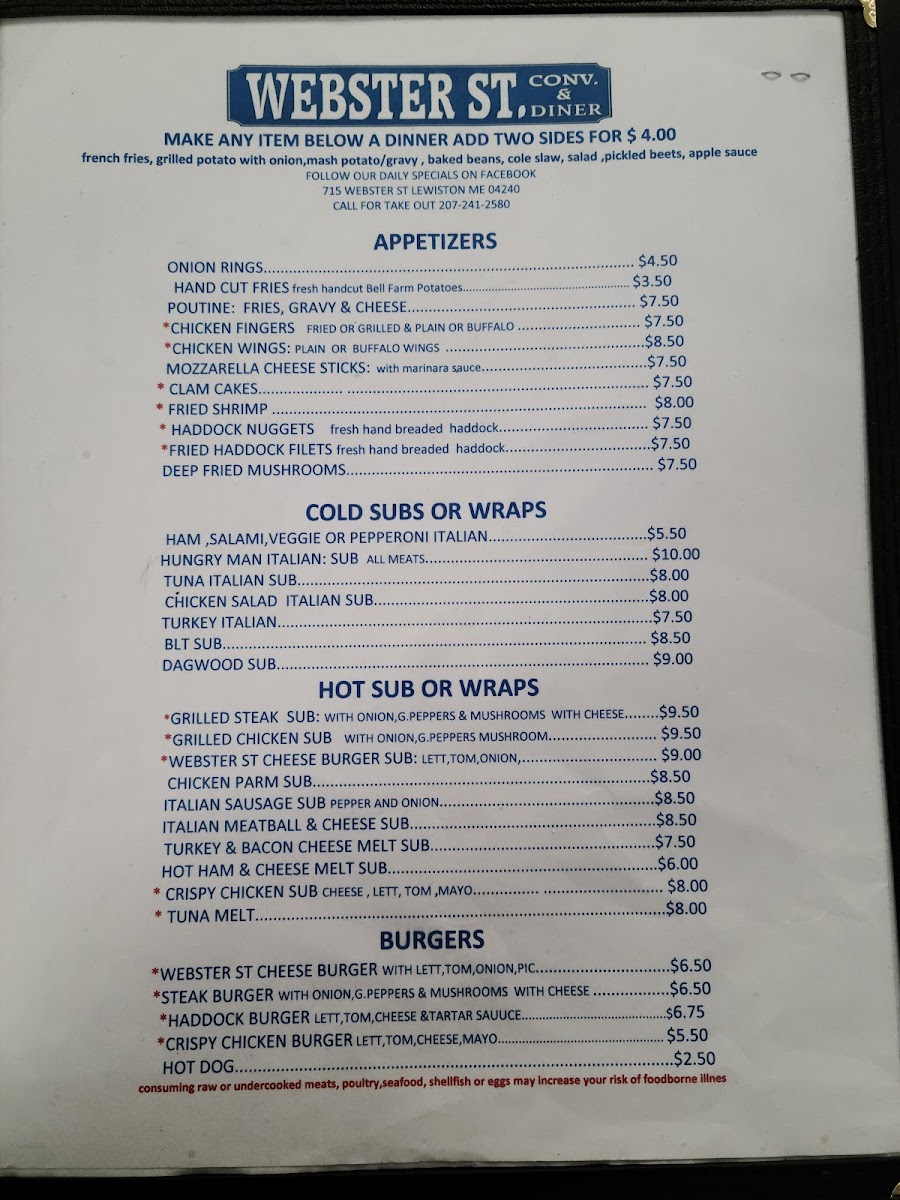 Introducing the menu at Webster Street Convenience Store and Diner, located in Lewiston, ME, offers a delightful blend of casual dining and local charm. This establishment, nestled at 715 Webster St, is renowned for its fresh seafood, particularly the impressive haddock dinner lauded by patrons for its quality and affordability. Your taste buds will be thrilled as you experience dishes crafted in-house, reminiscent of high-quality dining.